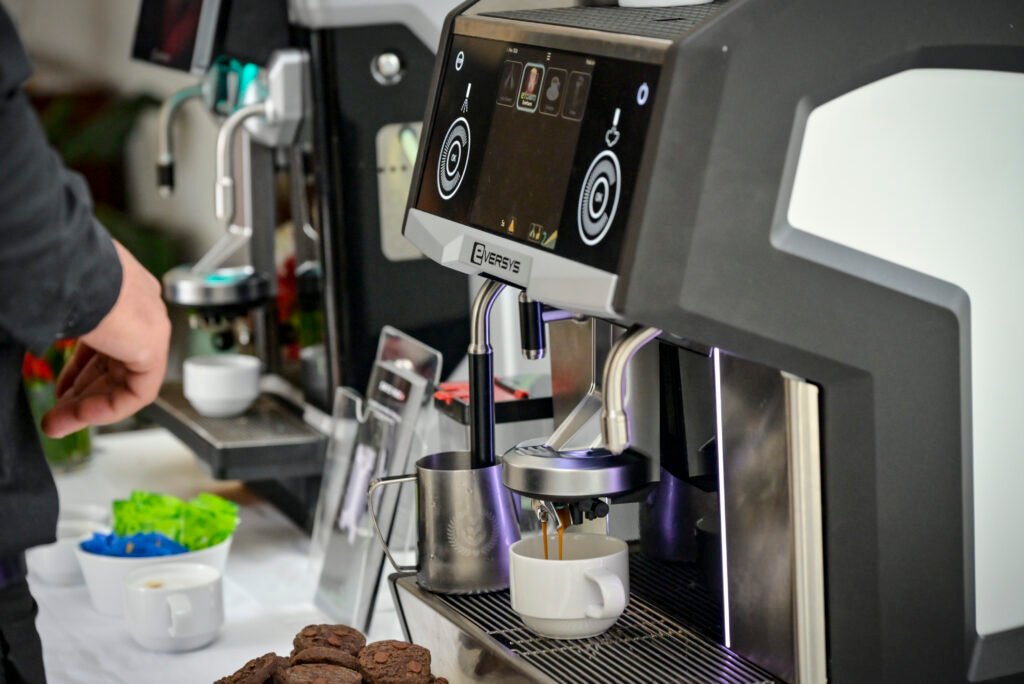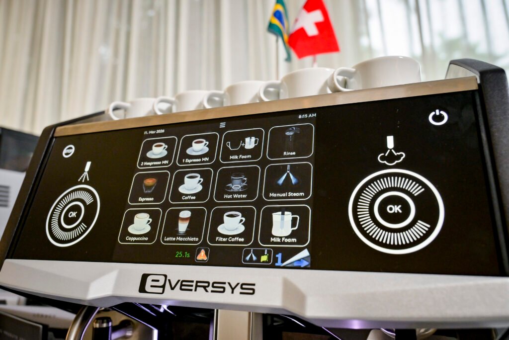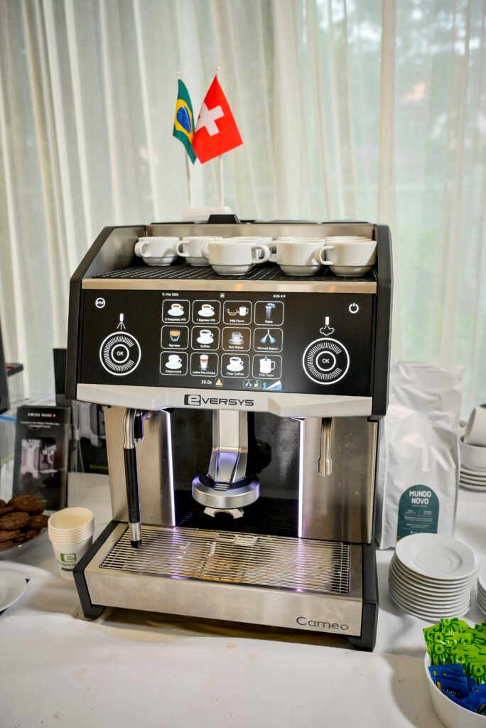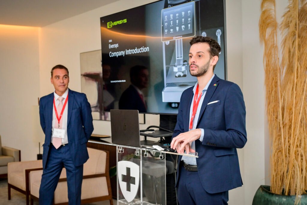 Durante o encontro, os convidados puderam conhecer mais sobre a proposta da Eversys, uma tecnologia que combina engenharia de precisão com a experiência sensorial de um café preparado por baristas. A apresentação conduzida por Julian, representante da marca no Brasil, destacou a facilidade de operação das máquinas, evidenciando como é possível alcançar um padrão elevado de qualidade com simplicidade e consistência.